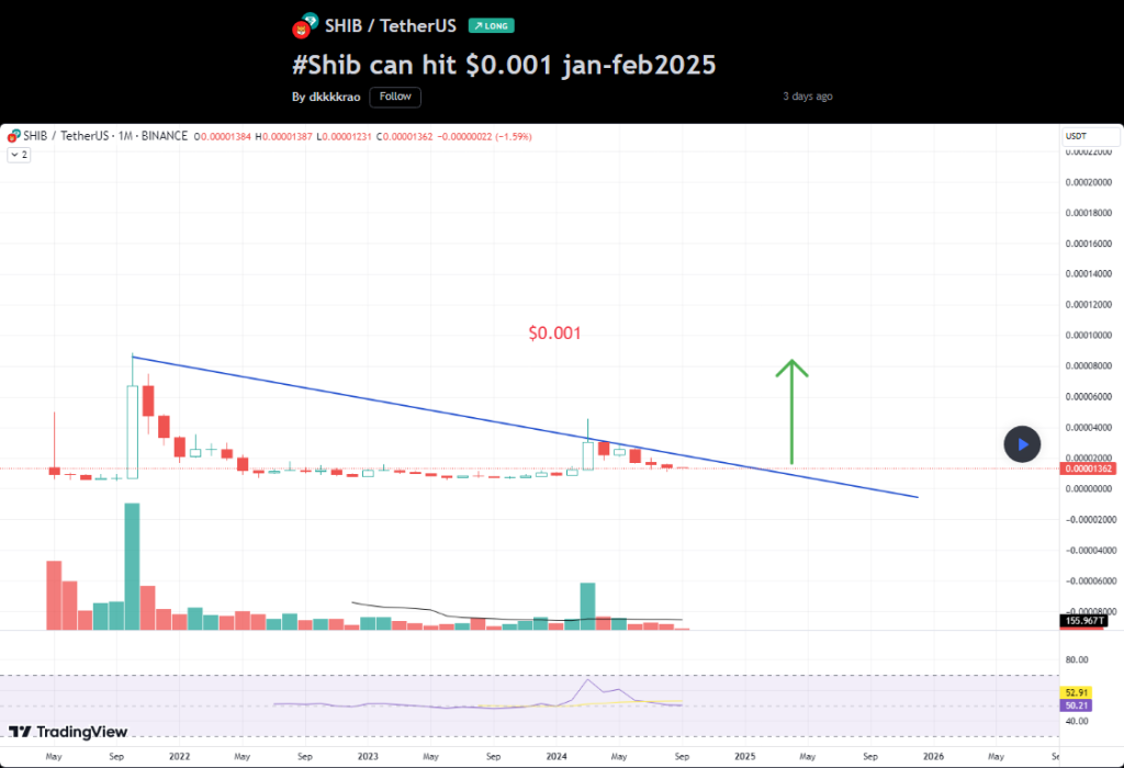 Shiba Inu (SHIB) can be building up steam for a jumbo rally as TradingView analyst Krao projects a massive 7,350 % increase. He said SHIB will breach $0.001 in the next few months, representing quite a jump from where it is now.