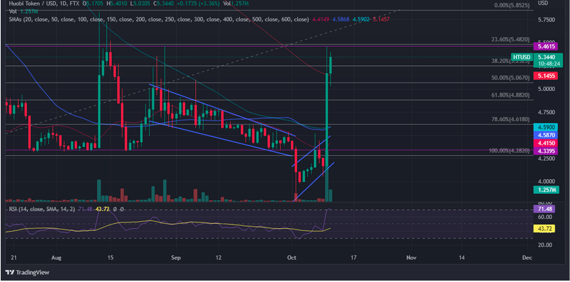 As of this writing, HT is trading at $6.62, up 61 percent in the last seven days, data from Coingecko show, Wednesday.