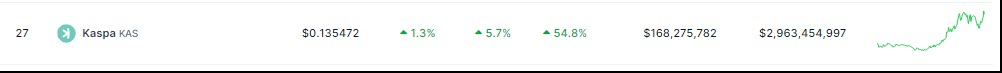 At the time of writing, KAS was trading at $0.135, up nearly 6% in the last 24 hours, and commanding a solid 55% rally in the last seven days, data from crypto price aggregator Coingecko shows.