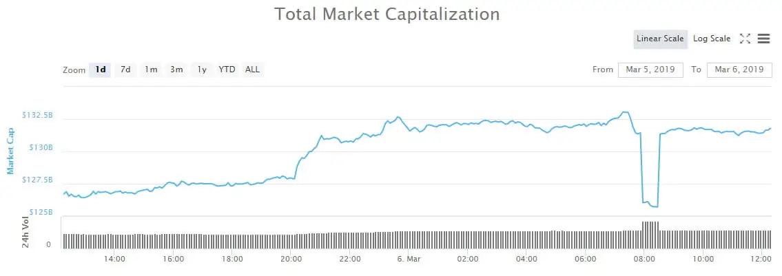 Another small rally initiated yesterday adding a further $6 billion to crypto markets and pushing total market capitalization back over $130 billion once again. An anomalous ‘flash crash’ can be seen in the charts for total market cap a few hours ago but it appears to be a glitch.