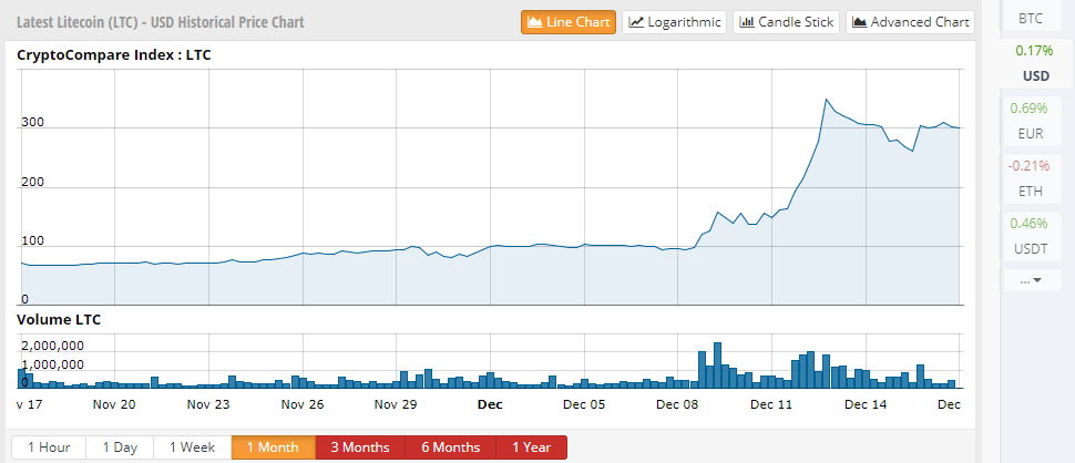 Since January 1, the price of Litecoin has surged from $3.63 to $302, as its market cap increased from below $177 million to $16.4 billion. The market valuation of Litecoin is currently larger than that of bitcoin in the beginning of 2017.