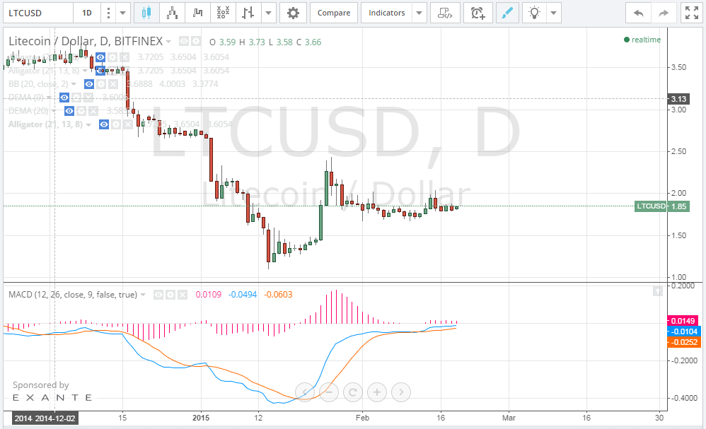 By studying the 1 day Bitfinex (LTC/USD) charts from tradingview.com and plotting the MACD indicator accordingly (look at the below chart), we can see the MACD blue line crossing above the red signal line, yet the MACD’s values is still in the negative territory. If the MACD’s value enters the positive territory within the next few hours, we can expect a bullish wave soon.
