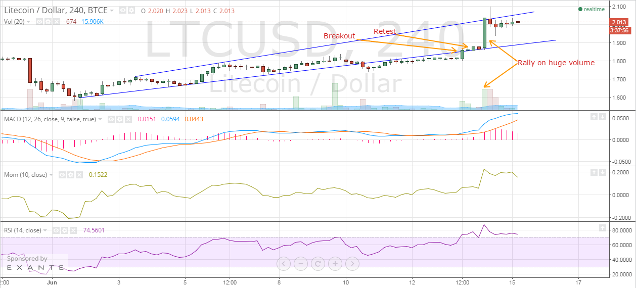 Litecoin jumped 12% over the weekend to surge to a 4-month high of $2.100 as bulls decide to take full control of the situation. In my previous analysis, I had discussed that the market may end its consolidation soon and now that it has, I expect the action to continue for a little longer.