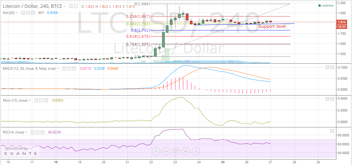 Litecoin bulls have extended their resting period and wait for market triggers to prompt the next leg of this rally. In the past 24 hours, the virtual currency has traded in a very narrow band of $1.790-1.834 as bears fail to exert enough pressure to bother the comfortably placed bulls.