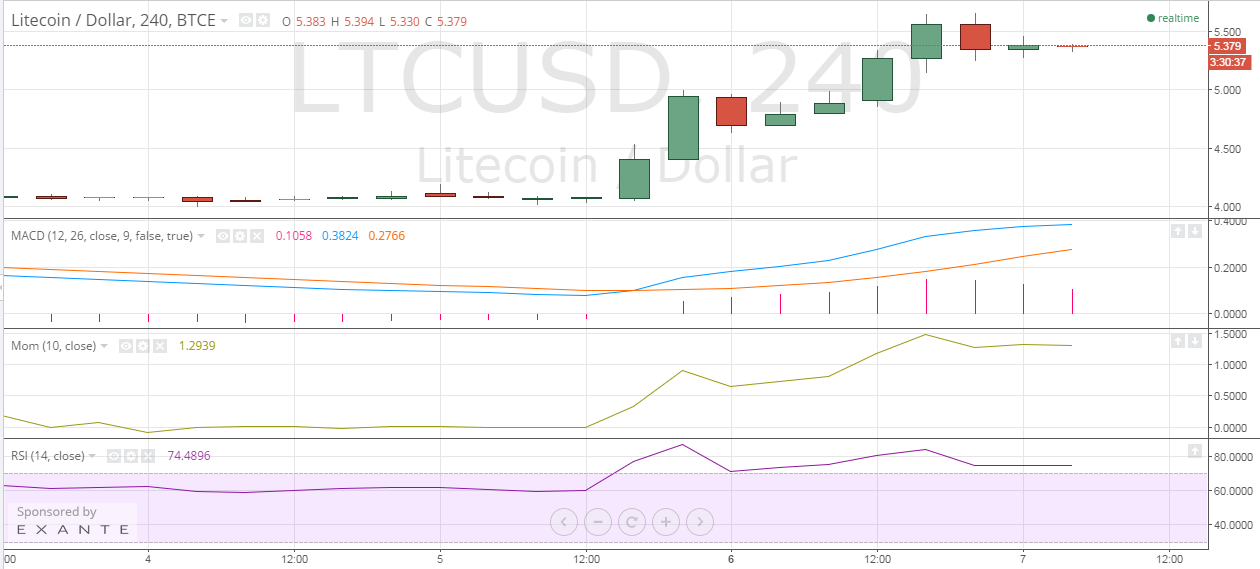Litecoin Chart Structure – The chart above clearly tells that Litecoin is currently trading near its 10-month high of $5.680. It hit an intraday high of $5.663 before some money was taken off the table.