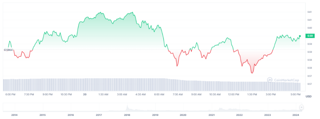 On the other hand, YCharts data presents a slightly different picture, indicating an XRP price of 0.6539 USD on March 19, 2024. This figure represents a 5.61% increase from the previous day and a significant 68% uptick from one year ago, showcasing a more positive outlook for XRP in the long term.