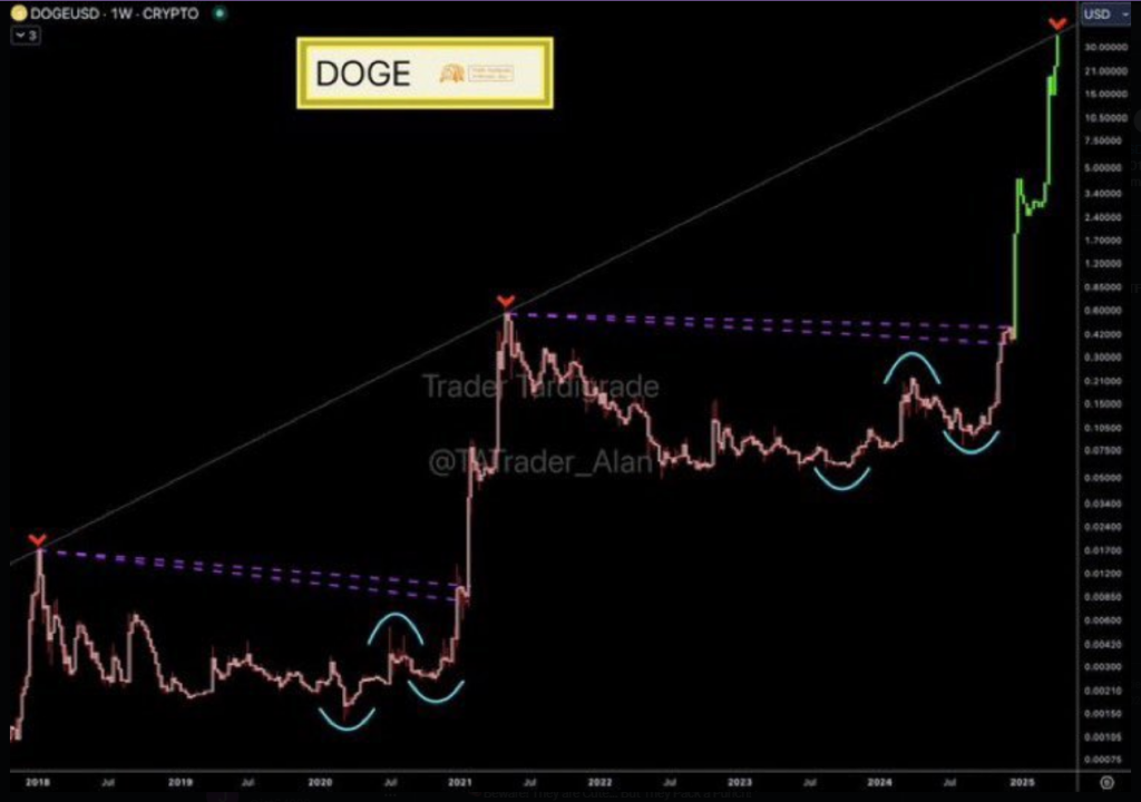 In 2021, a similar setup propelled DOGE to its all-time high of $0.7376. Now, with the coin trading around $0.4075, there’s growing anticipation for another sharp upward trajectory. Veteran analyst Cantonese Cat has even speculated that Dogecoin could reach $24 in the long term if the broader market remains bullish.