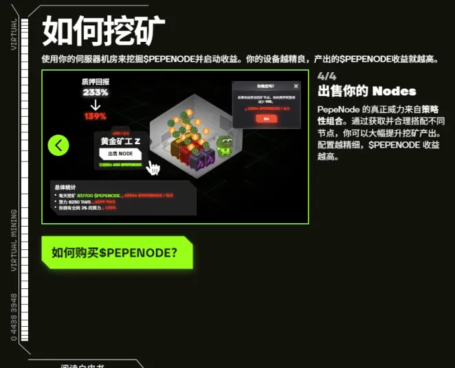 你的每一步操作(例如購買節點、升級設施)都要用 PEPENODE 來支付,而且每一個選擇都會帶來後果:如果你把錯誤的節點組合在一起,你的礦機就會變得不穩定、開始變慢;如果你搭配對了節點,你的算力裝置就會突然高效運轉,像一個運轉良好的礦場一樣“列印”代幣。