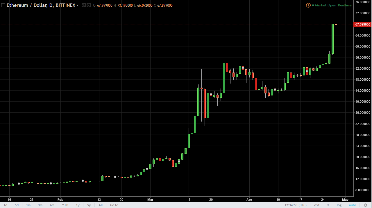 Ethereum tried to rally during the day on Friday against the US dollar, but struggled at the $74 level. By pulling back the way it has, we have formed a shooting star which is a very negative technical signal. However, I see a significant amount of support below at the $60 level, so it’s likely that the buyers will return. A breakdown below the bottom of the candle signals that sellers are stepping back into the market. However, the longer-term trend is most certainly to the upside so waiting for lower levels to go long will be the way to trade this market.
