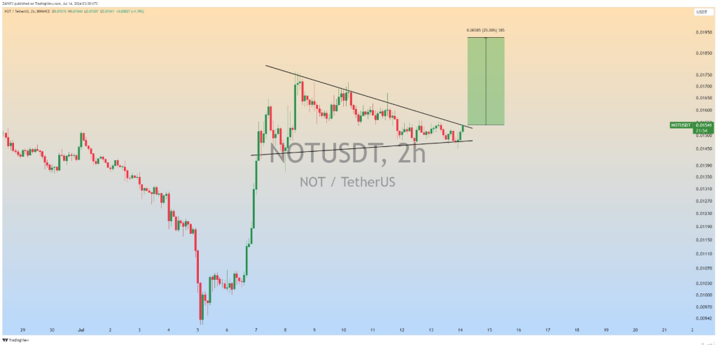 NOT/USDT has caught the radar of ZAYK Charts, which has observed a so-called pennant shape developing that could indicate a price spike is underway.