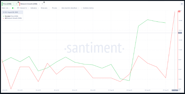 On-chain data analytics provided by Santiment underscored the significant influx of users into the OKB ecosystem. Prior to the Token 2049 sponsorship announcement, the Network Growth score for OKB stood at a modest 3 on August 2.