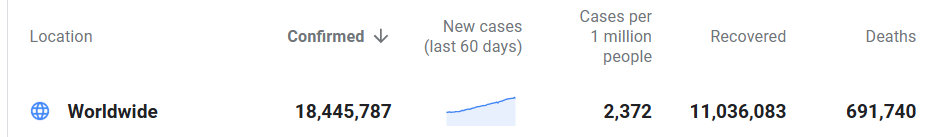 According to Google, worldwide deaths have reached 692k, and the number of new cases in the last two months is continuing to rise.