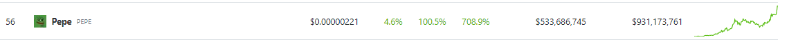 The momentum didn’t stop there, as the coin continued its meteoric rise, boasting a remarkable seven-day increase of 708%, defying all expectations and proving its worth as a contender in the world of meme coins.