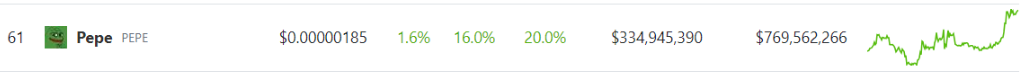 PEPE, currently priced at $0.00000185 according to CoinGecko, has recently experienced a remarkable surge in its value. Over the course of 24 hours, the asset witnessed a notable rally of 16%, and within the span of just seven days, it soared by an impressive 20%.