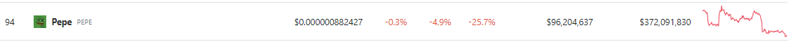 Pepecoin (PEPE) has undergone a substantial price decline, as evidenced by data provided by CoinGecko, which indicates a decrease of 4.9% within the past 24 hours. Moreover, PEPE has witnessed a significant slump of 25.7% over the course of the last seven days, further emphasizing the cryptocurrency’s continued downward trajectory.