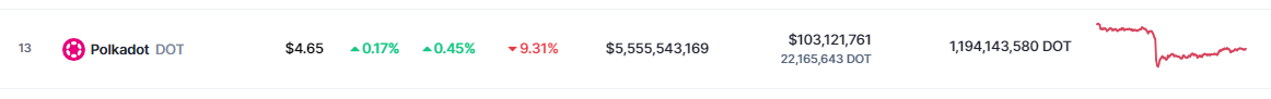 As of now, DOT continues to face a considerable setback, with a seven-day decline of 9.31%. CoinMarketCap reports DOT’s current price at $4.65. This substantial decrease in value has raised questions about the asset’s ability to regain its previous strength.