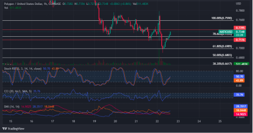 The price range of $0.7395 represents the primary level of resistance on this chart. If the bulls gain pace and break through this level of resistance, the MATIC token could be on the verge of a recovery.
