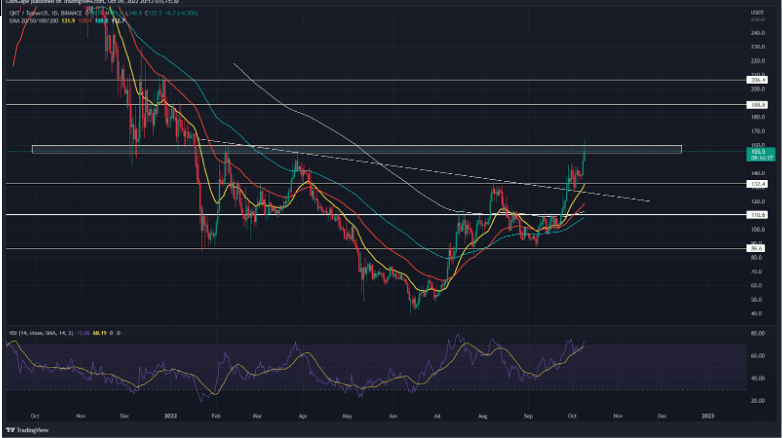 At press time, tracking from Coincodex shows the crypto is changing hands at $153.63 and is enjoying a 14.44% increase for the past week.
