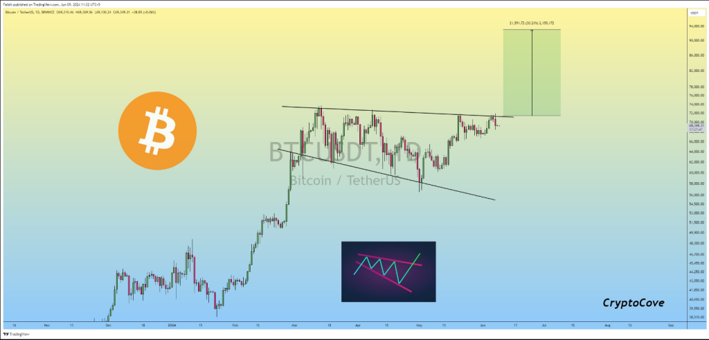 BTC is now attracting support at the $68,500 mark, the top edge of the symmetrical triangle formation. If present support persists, Bitcoin can climb 7% to reach its all-time high of $73,777.