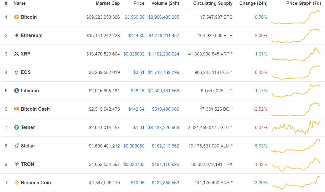 The crypto asset holding above the rest and continuing to surge at the time of writing is Binance Coin. In less than a week BNB has made and held an epic 30% climbing from less than $8.50 last week to $11 before dropping a little to today’s price just below it. On the day BNB is up 13.5% as it outshines every other altcoin in the top fifty.