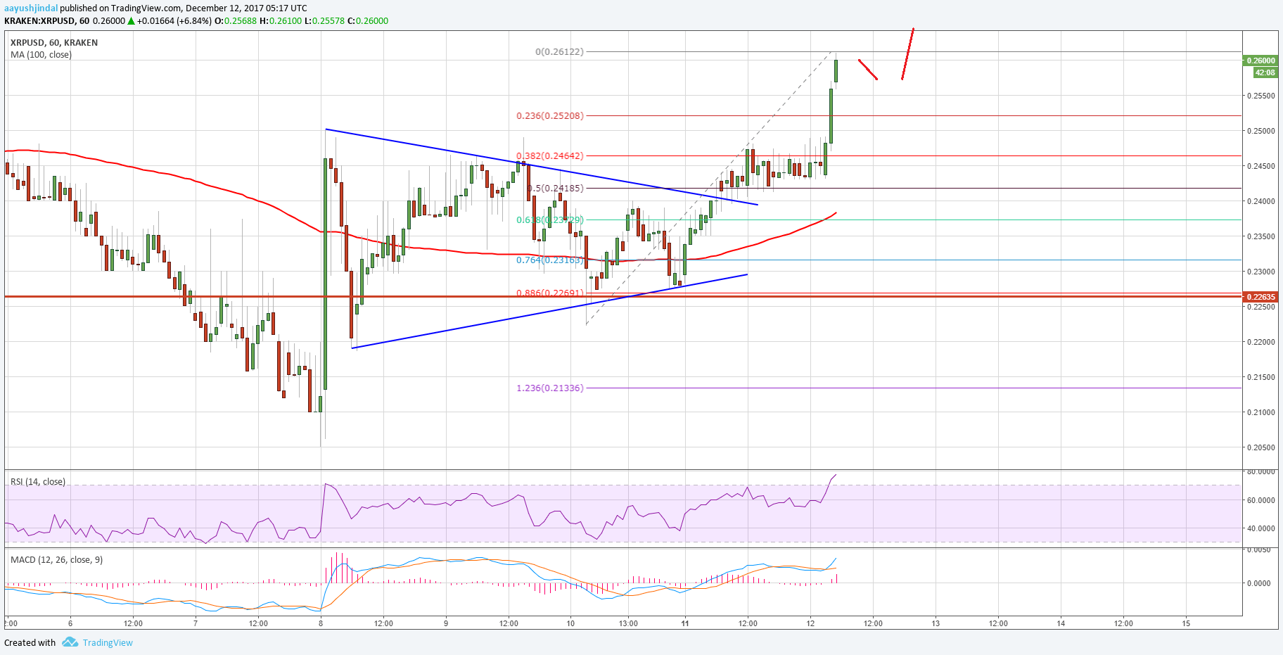 During the upside, yesterday’s highlighted contracting triangle with resistance at $0.2400 was broken on the hourly chart of the XRP/USD pair. The pair recently traded as high as $0.2612 and is currently placed well above the 100 hourly simple moving average. It seems like there can be more gains above $0.2600 in the near term. The next major resistance is around the $0.2800 pivot.
