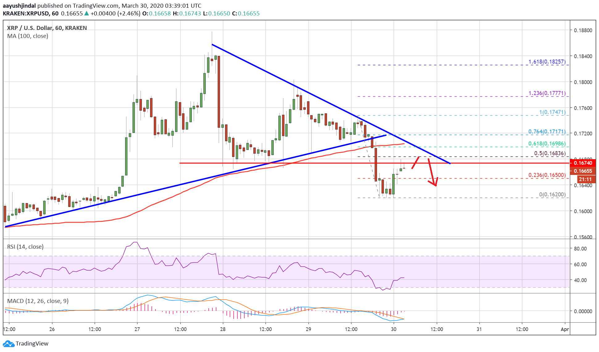 - There is a key bearish trend line forming with resistance near $0.1685 on the hourly chart of the XRP/USD pair (data source from Kraken).