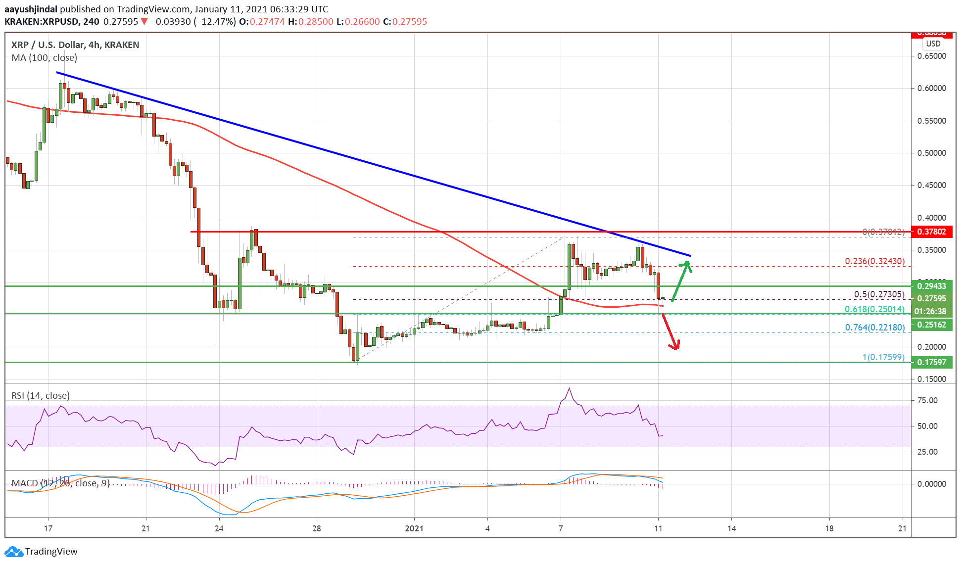There is also a key bearish trend line forming with resistance near $0.3320 on the 4-hours chart of the XRP/USD pair. The price is now testing the $0.2600 support zone and the 100 simple moving average (4-hours).
