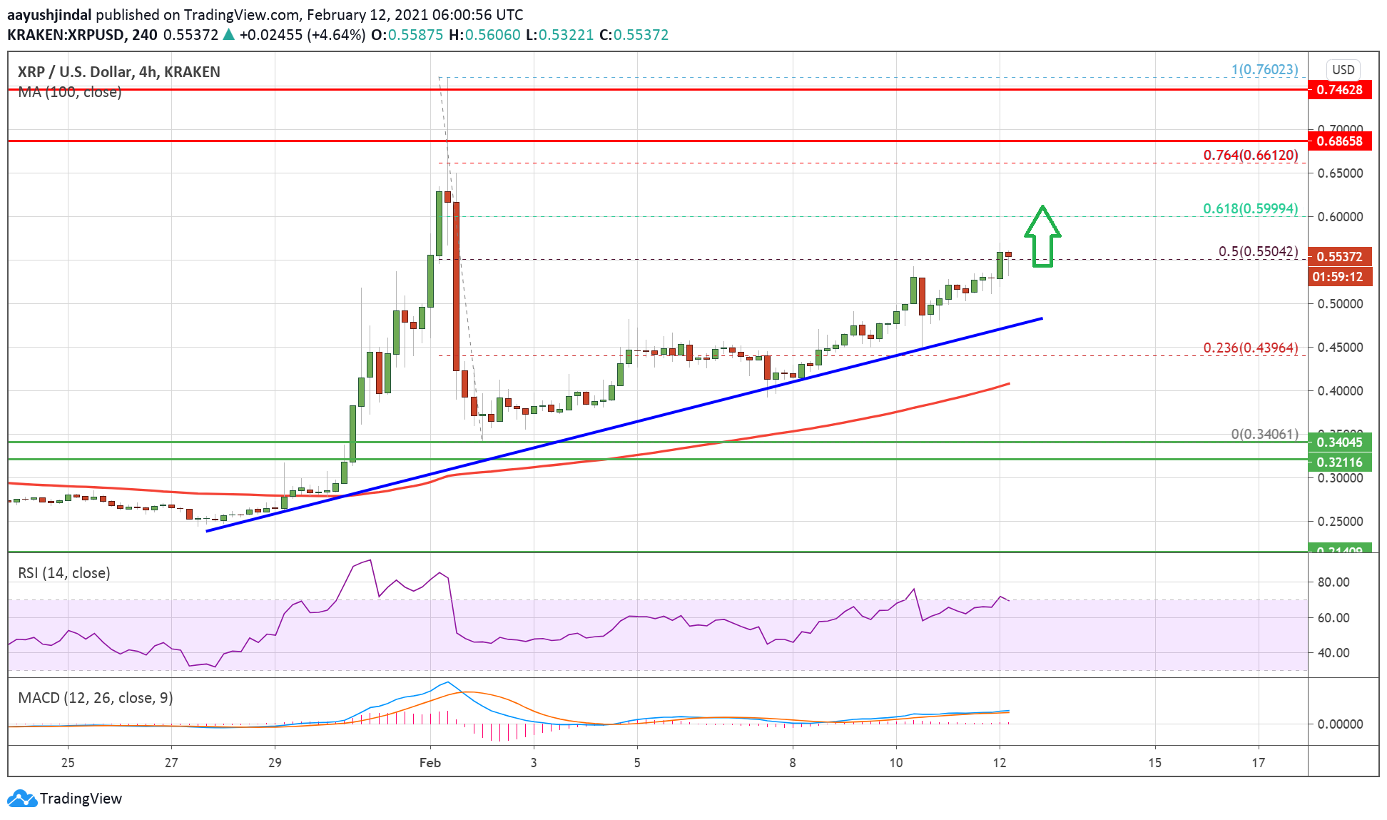 Ripple is up over 15% and it broke the $0.5500 resistance against the US Dollar. XRP price is likely to continue higher towards $0.5800 and $0.6000 levels in the near term.