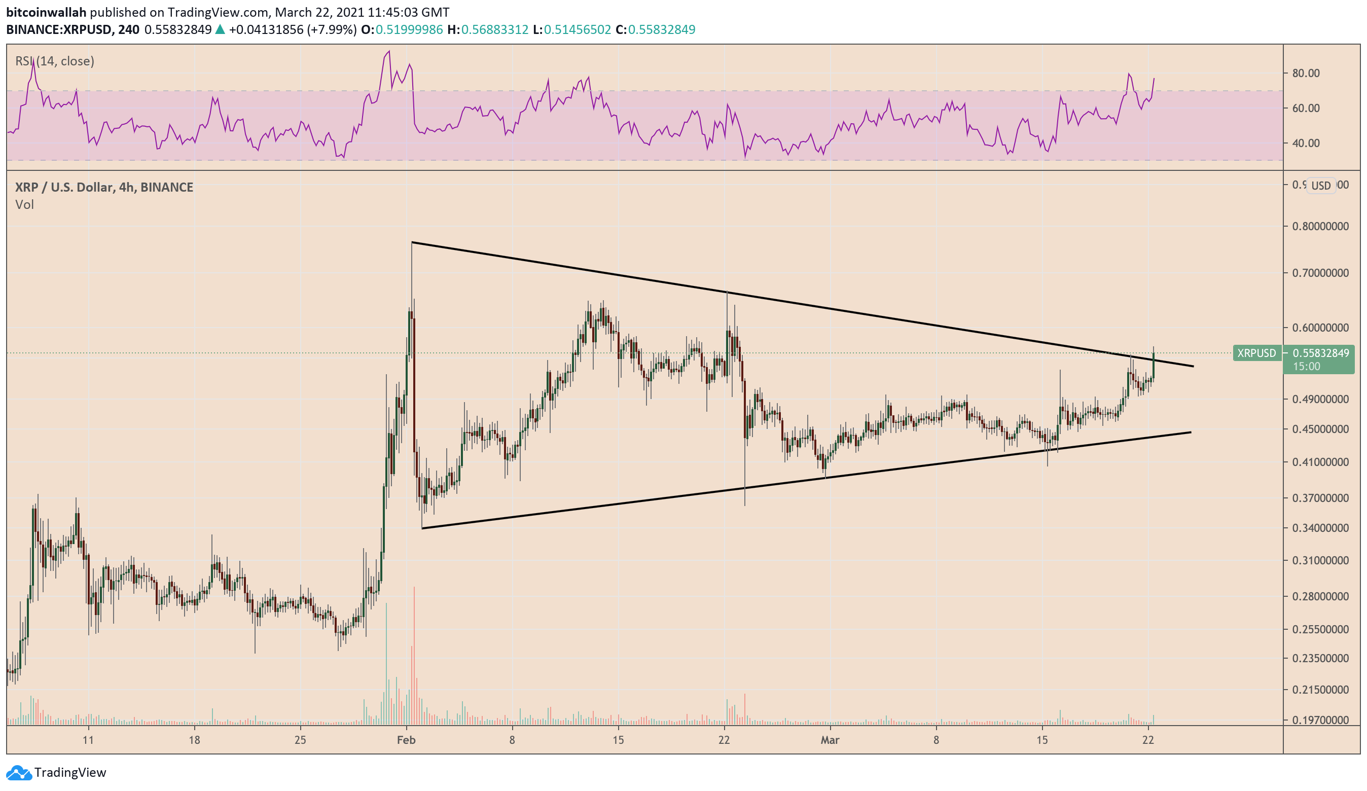 XRP surged by up to 10 percent on Monday, logging an intraday high at $0.568 before correcting lower during the European trading hours on short-term profit-taking sentiment. Nonetheless, the token managed to jump above a crucial medium-term descending trendline resistance, raising hopes that it would undergo a bullish breakout move.