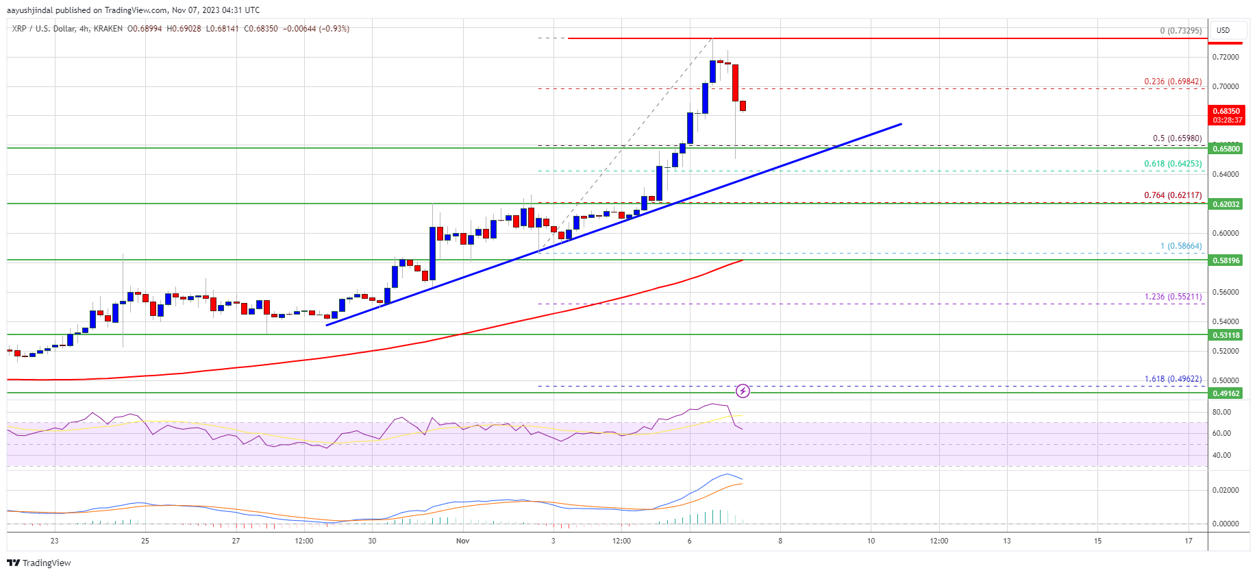 The bulls even pumped above the $0.650 resistance zone. Finally, a new multi-week high was formed near $0.7329 and the price recently started a downside correction. There was a move below the $0.620 level. The price even declined below the 23.6% Fib retracement level of the upward move from the $0.5866 swing low to the $0.7329 high.