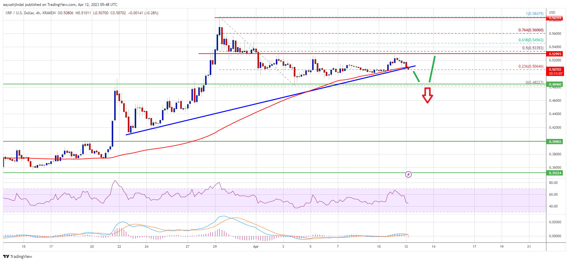 - There is a major bullish trend line forming with support near $0.5065 on the 4-hours chart of the XRP/USD pair (data source from Kraken).