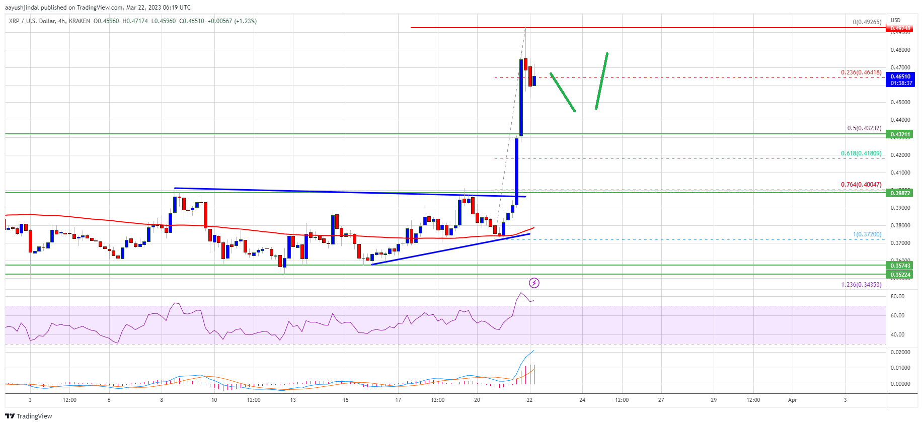 Finally, the bulls were able to clear a major hurdle near the $0.400 zone. Besides, there was a break above a contracting triangle with resistance near $0.3980 on the 4-hours chart of the XRP/USD pair. The pair rallied over 25% and there was a clear move above the $0.450 resistance.
