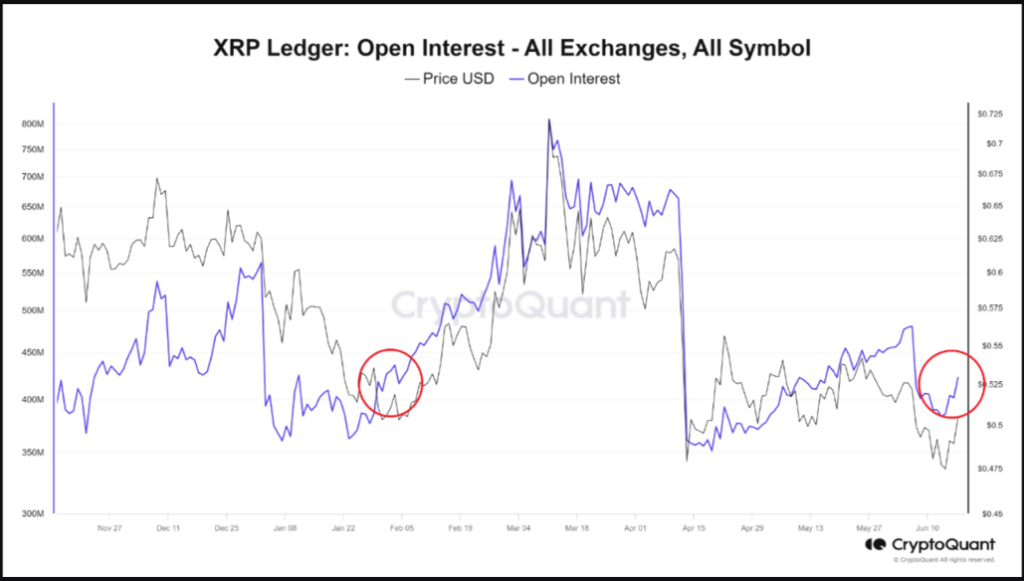 XRP’s open interest on CryptoQuant’s platform for bitcoin research showed a clear surge, implying a growing investor count joining ranks. Investors predicting a future price increase for XRP point to a good attitude displayed in this trend. The simple justification is that as more buy-order entering players join the market, the price often rises.