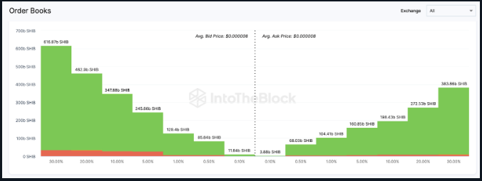 Optimistic investors have initiated live purchase requests for nearly 2 trillion SHIB tokens, marking a rise of 400 billion compared to the 1.5 trillion SHIB orders registered the previous week. In contrast, the quantity of sell orders has maintained its position at 1.2 trillion SHIB tokens, showing little movement.