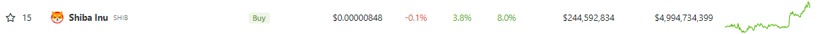 As of this writing, Shiba Inu is ranked by CoinGecko as the 15th-largest cryptocurrency by market cap, having a value of nearly $5 billion.