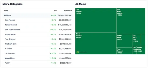 更廣泛的市場亦隨之上漲,週二錄得3.88%漲幅,並在週三歐洲開盤前再漲0.57%。動能迅速傳導至Meme幣,推動其總市值24小時內大漲8%,突破 810億美元,交易量在同一時期也達到 88億美元。