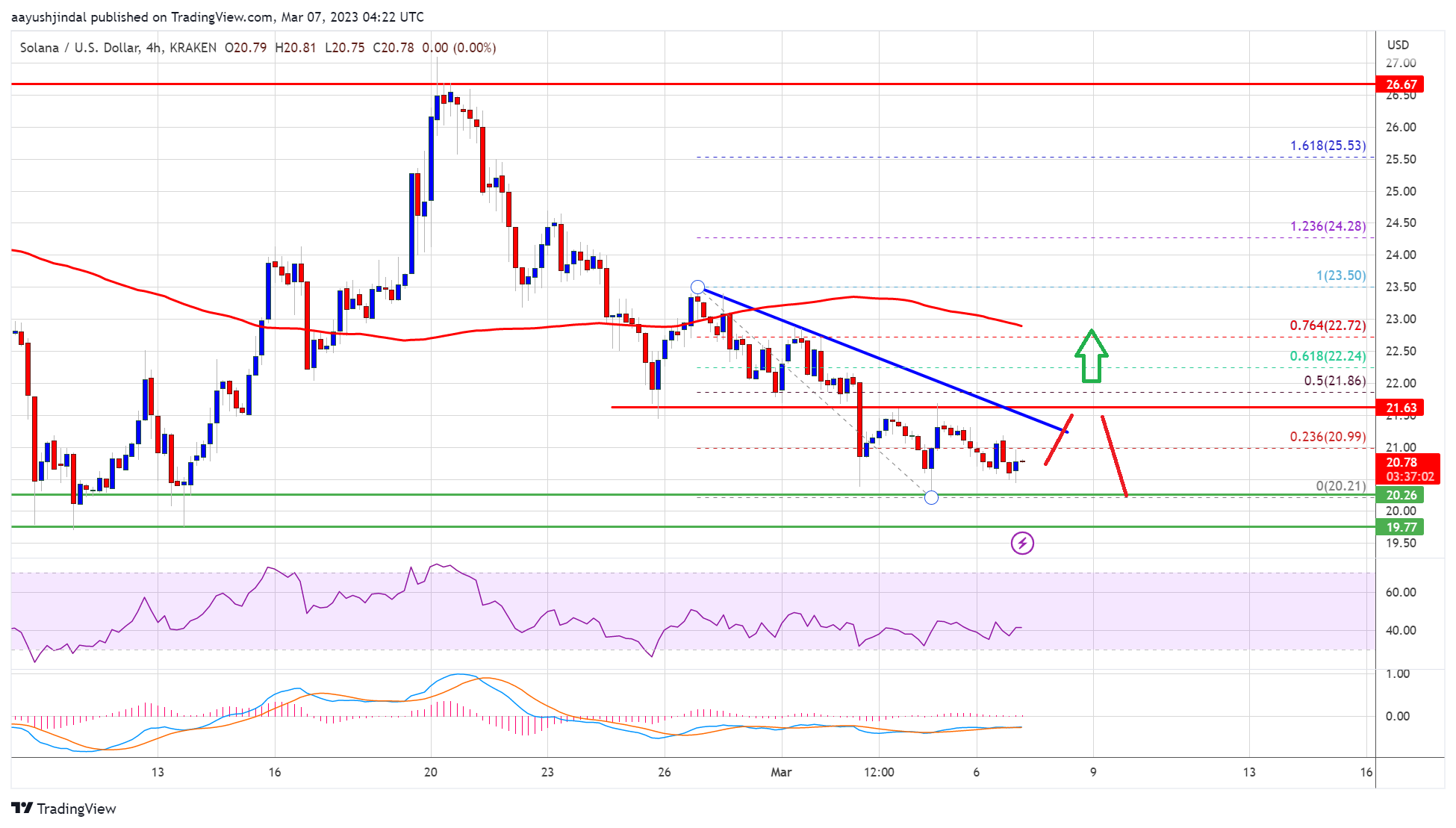 The price even declined below the $20.50 support zone. A low was formed near $20.21 and the price is now consolidating losses. The price is now trading below $22 and the 100 simple moving average (4-hours). There is also a major bearish trend line forming with resistance near $21.60 on the 4-hours chart of the SOL/USD pair.