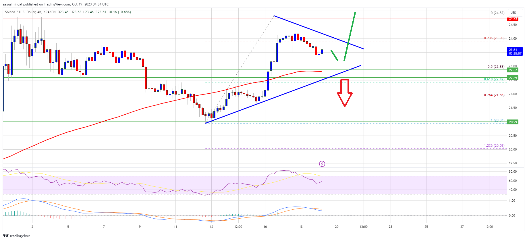 There was a move below the $24.20 and $22.00 levels. The bears pushed the price below the 23.6% Fib retracement level of the upward move from the $20.94 swing low to the $24.82 high. There is also a key contracting triangle forming with resistance near $23.90 on the 4-hour chart of the SOL/USD pair.