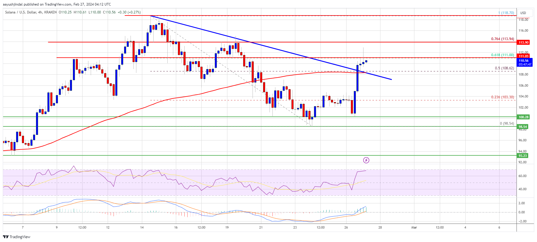 Solana is now trading above $110 and the 100 simple moving average (4 hours). Immediate resistance is near the $111 level. The next major resistance is near the $114 level or the 76.4% Fib retracement level of the downward move from the $118.70 swing high to the $98.54 low.