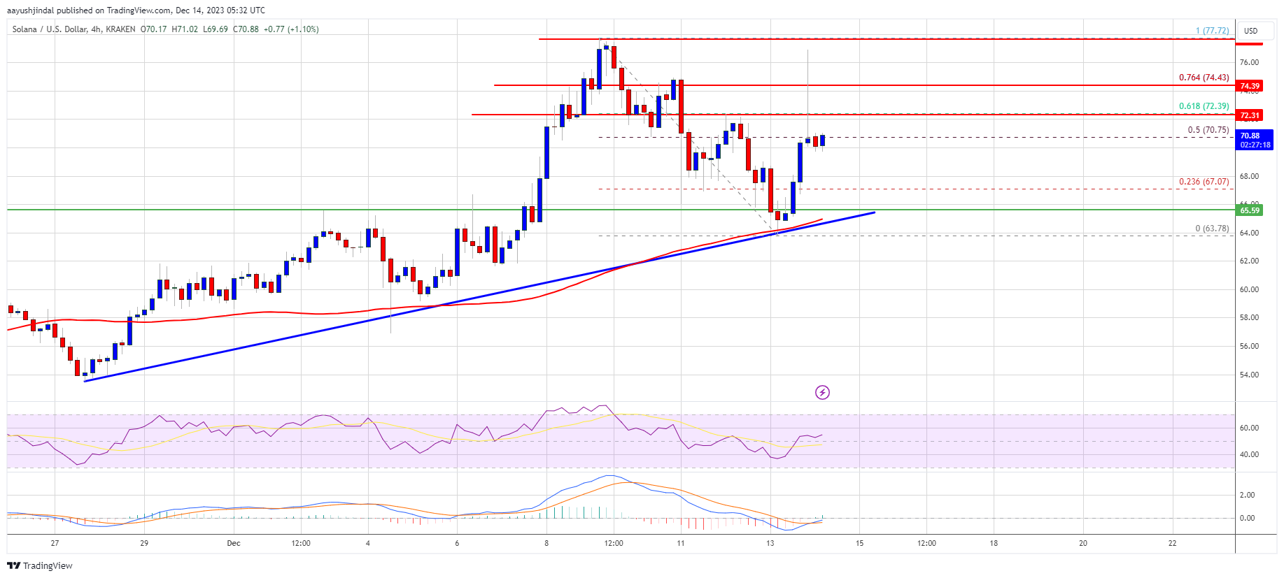 SOL is now trading above $68 and the 100 simple moving average (4 hours). There is also a major bullish trend line forming with support near $65.50 on the 4-hour chart of the SOL/USD pair.
