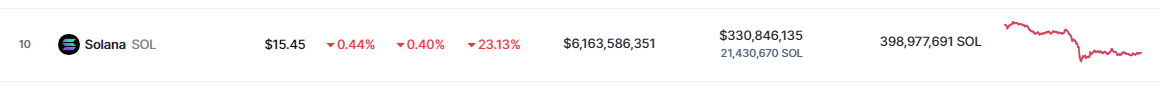 In light of this regulatory setback, investors closely monitor SOL’s performance. According to CoinMarketCap, SOL is currently priced at $15.45, sustaining a seven-day slump of 23.13%.