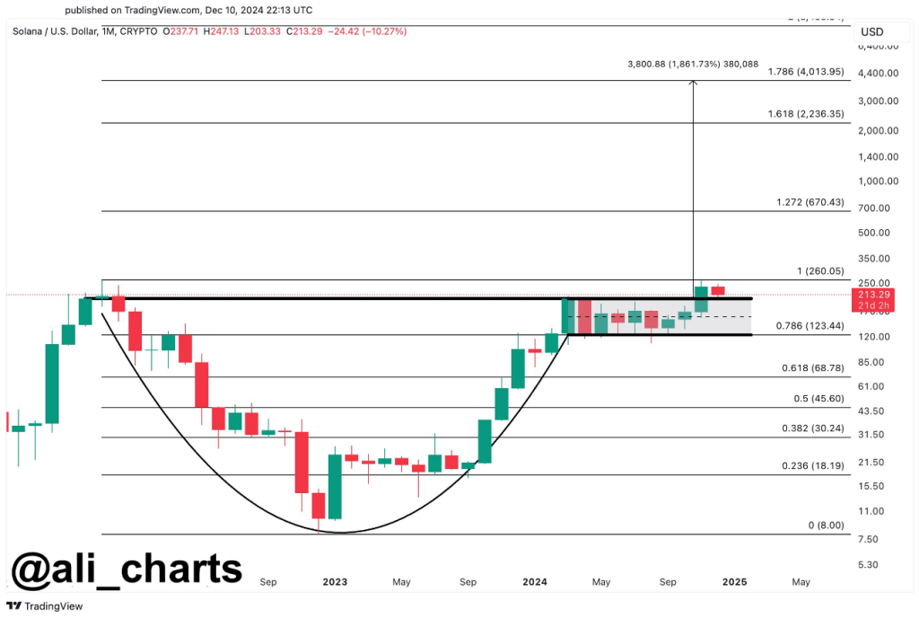 Still, forecasts of Solana’s eventual price vary widely. Inspired by the “cup and handle” chart pattern showing on monthly charts, crypto analyst Ali Martinez thinks SOL might reach $4,000. This optimistic framework suggests that a breach above $260 would cause exponential increase.