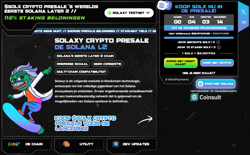 Omdat Solaxy nog in de presale fase zit, zal de prijs tot aan de lancering alleen maar stijgen. Als je nu bijdraagt aan het project krijg je ook tot 150% beloningen op staking. Via de link kom je op de officiële website, waar je eenvoudig je wallet kunt koppelen. Vervolgens kun je afrekenen met crypto en creditcard, momenteel kost 1 SOLX slechts $0,001728.
