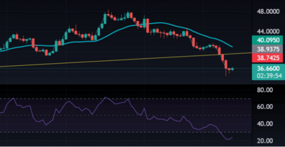 Solana also loses a critical support level set at $39.5 mainly due to widespread crypto crash which pushed Solana into a bearish stance.