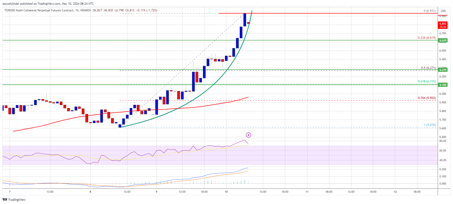 Toncoin traded close to the $7.00 level. A high was formed at $6.93 and the price is now consolidating gains. It is trading near the $6.80 zone and well above the 100-hourly Simple Moving Average. There is also a key parabolic curve forming with support at $6.80 on the hourly chart of the TON/USD pair.