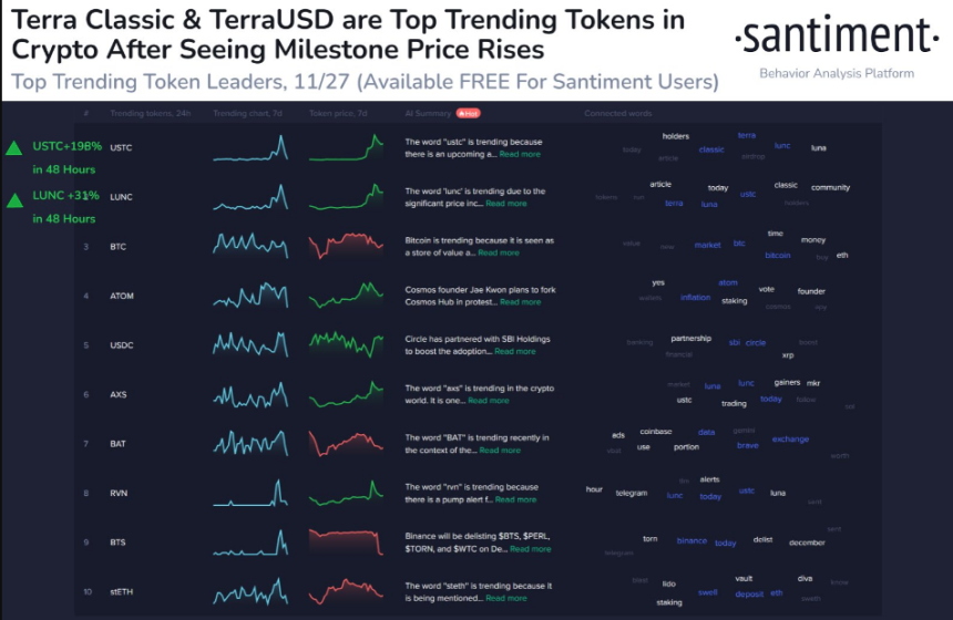 Following a significant price increase, traders are talking favorably about LUNC. After its recent collapse, sentiment analysts predict that the tokens will see a resurgence in value.