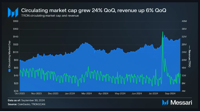 TRON, with its native token TRX, has been on a tear in the last few months, with its impressive market cap growth. Based on Messari’s tracking for Q3 2024, TRX’s market capitalization increased by 24%, from nearly $11 billion to $13.5 billion. This marks the seventh consecutive quarter in which the token has increased its circulating market cap, pushing the company into the Top 10 biggest cryptos by market cap.
