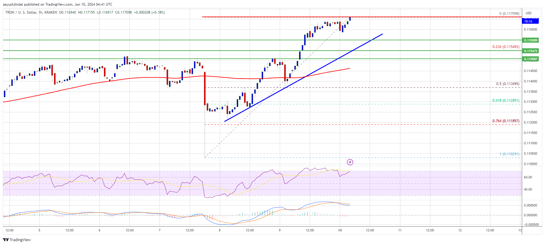 There was a decent move above the $0.1150 resistance zone. TRX price cleared many hurdles and gained over 3%. There was a move above the $0.1165 level. A high is formed at $0.1170 and the price is now consolidating gains above the 23.6% Fib retracement level of the upward move from the $0.1102 swing low to the $0.1170 high.