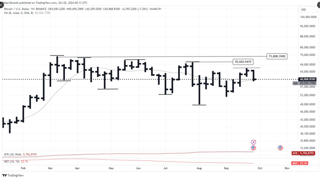Only a close above 71,000 confirmed by a new ATH will indicate that the trend from the Nov 2022 low remains in force pic.twitter.com/lFO9A20VPD— Peter Brandt (@PeterLBrandt) October 2, 2024