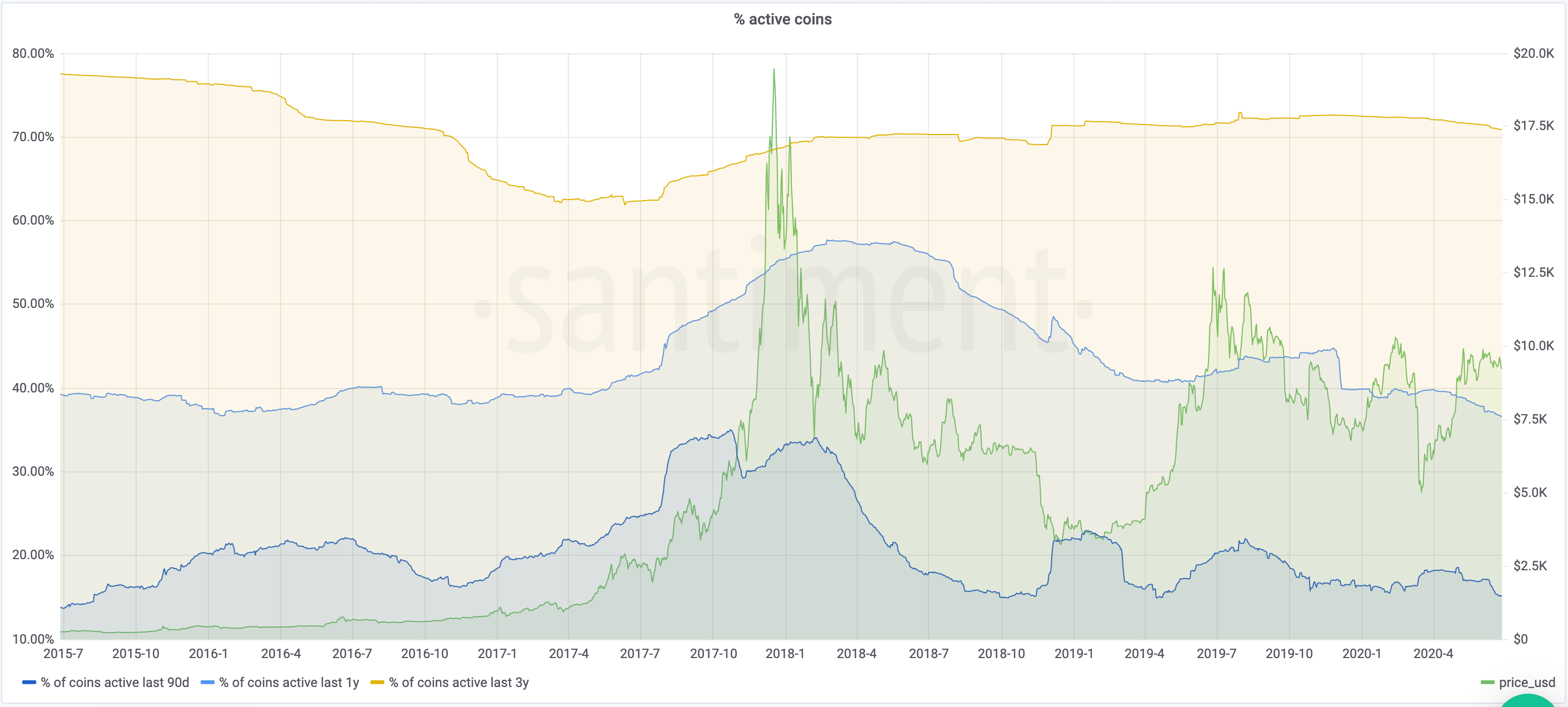 The Percentage of Active Bitcoin Declines Over Time. (Source: Santiment)